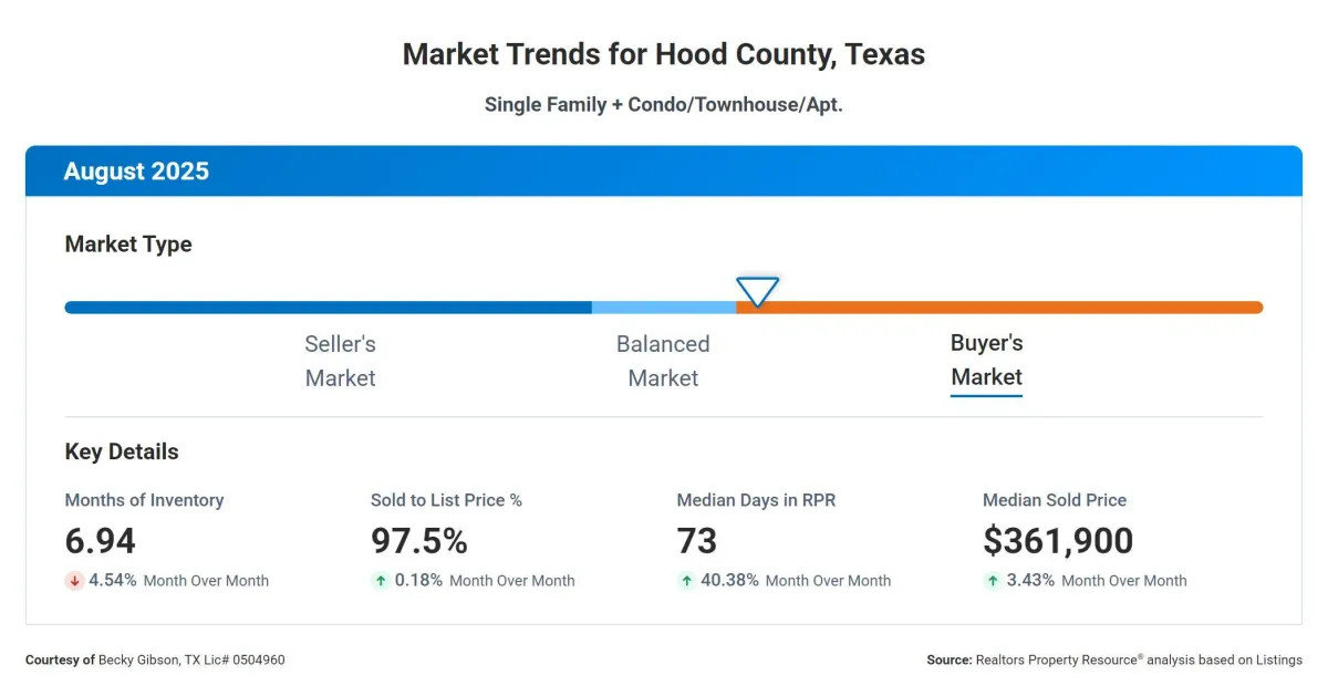 Great question — and it’s exactly why I create this update each month. The market is always shifting. Sometimes buyers have more negotiating power with extra inventory, and other times sellers have the edge with quicker sales and stronger offers. In my monthly video, I break down the numbers — prices, days on market, and inventory — so you’ll know exactly where Hood County stands this month.